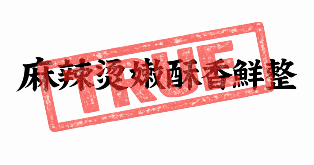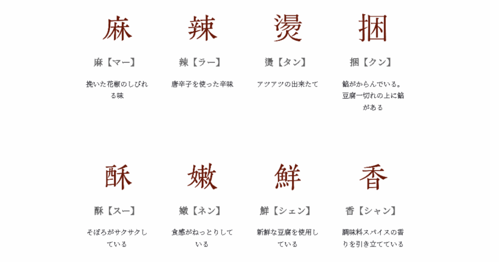 「麻(マー)・辣(ラー)・烫(タン)・嫩(ネン)・酥(スー)・香(シャン)・鲜(シェン)・整(チェン)」