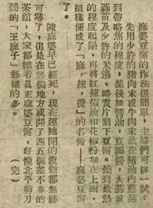 それ以前の言及だと、1948年の『农业生产』という雑誌では「麻、辣、烫」が味の要素として使われており、少なくとも3文字は1960年以前から使われていました。